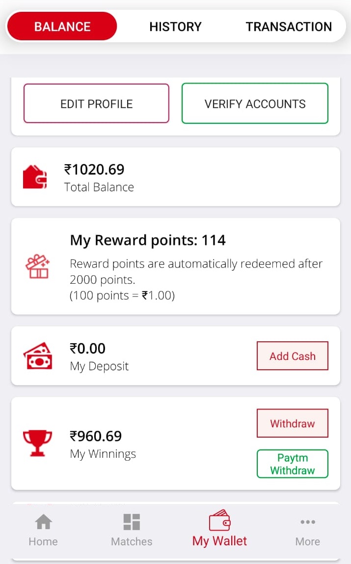 Your WalletHere, You will get your account details. Your Deposit, Bonus and Your Winning. You can take money in Paytm, BANK and UPI